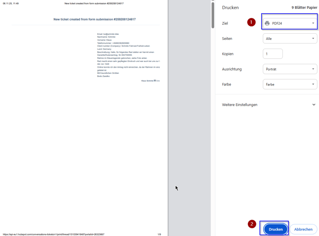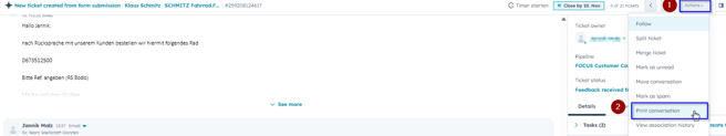 Um ein Konversationsverlauf an die andere Instanz zu schicken müsst ihr diesen im Helpdesk als PDF drucken: